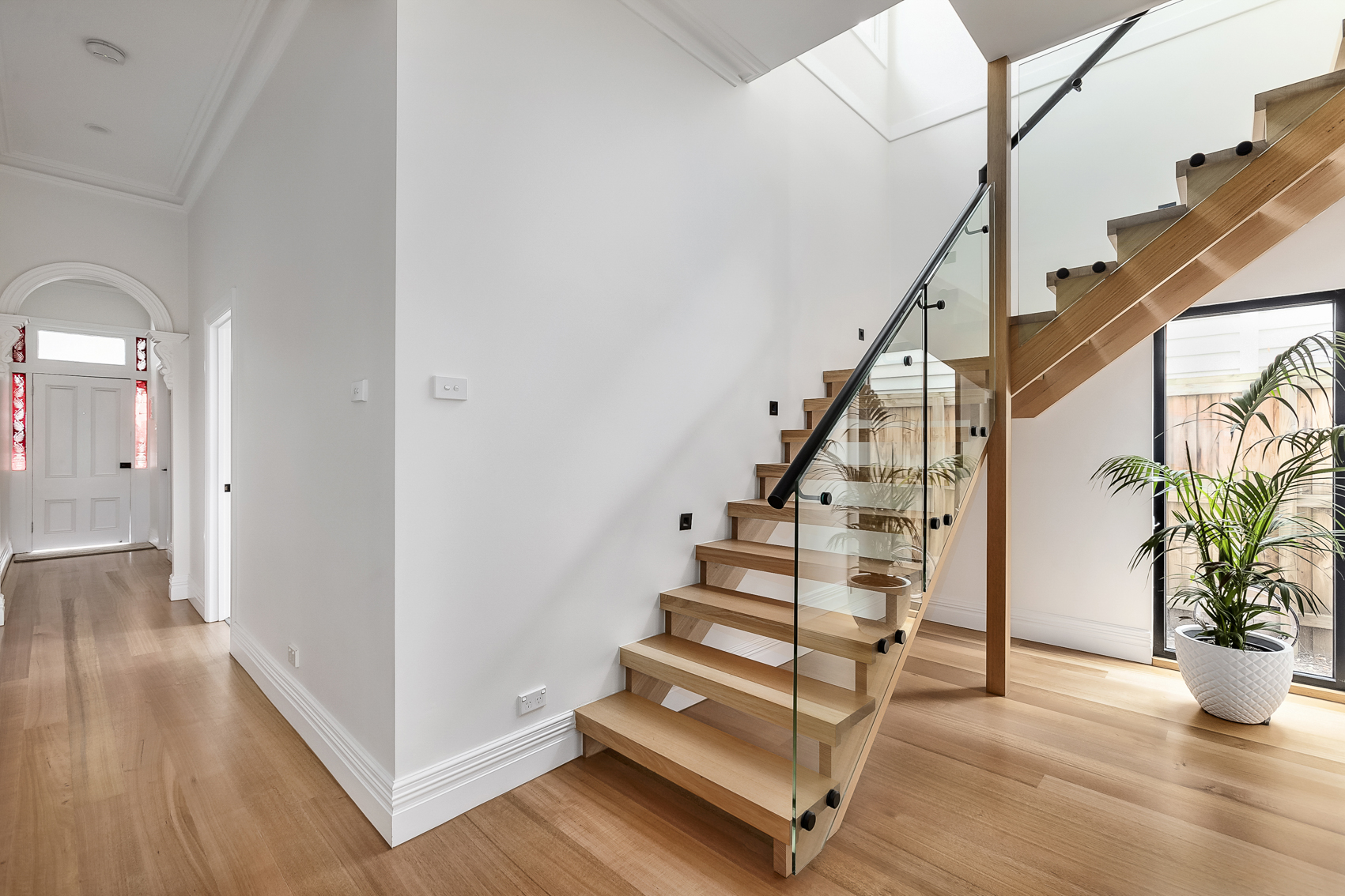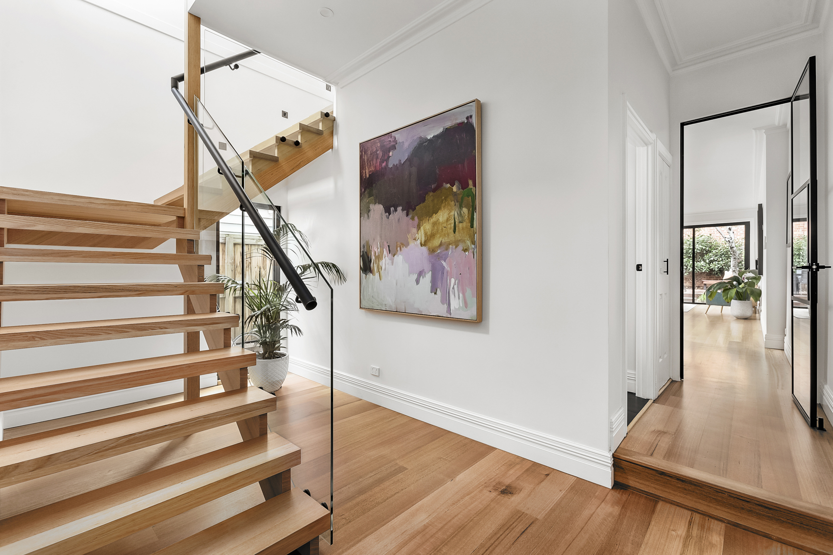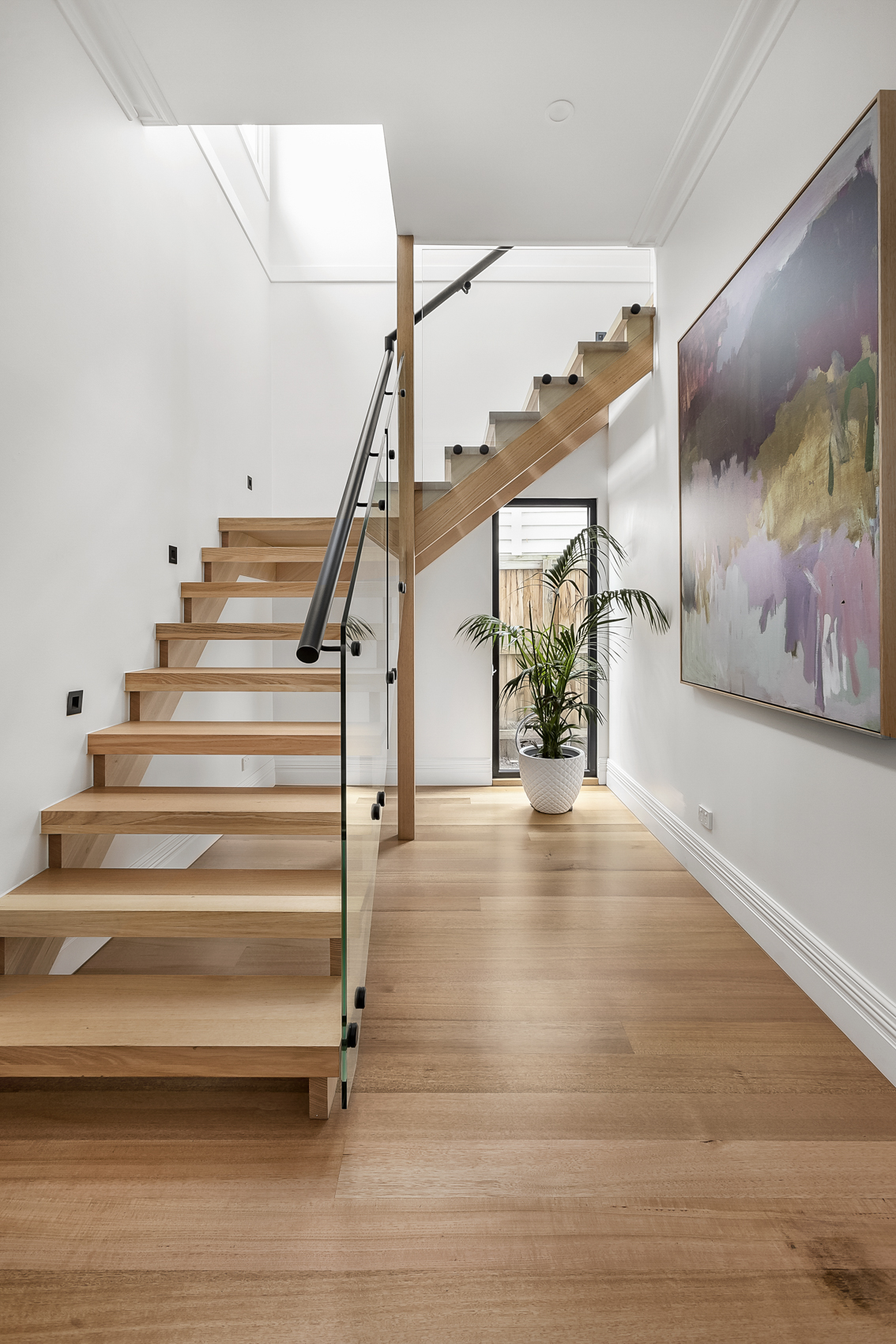 This light-filled home features an open tread staircase offering a warm and welcoming feel to the home. At the top of the modern timber staircase is a spacious landing that offers beautiful glimpses of the cityscape.
