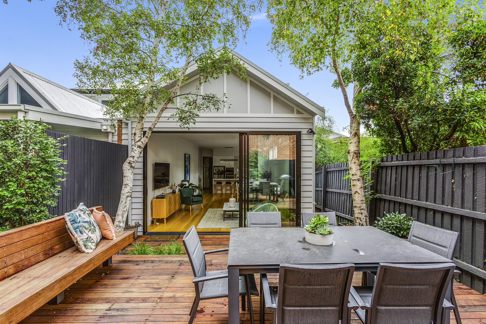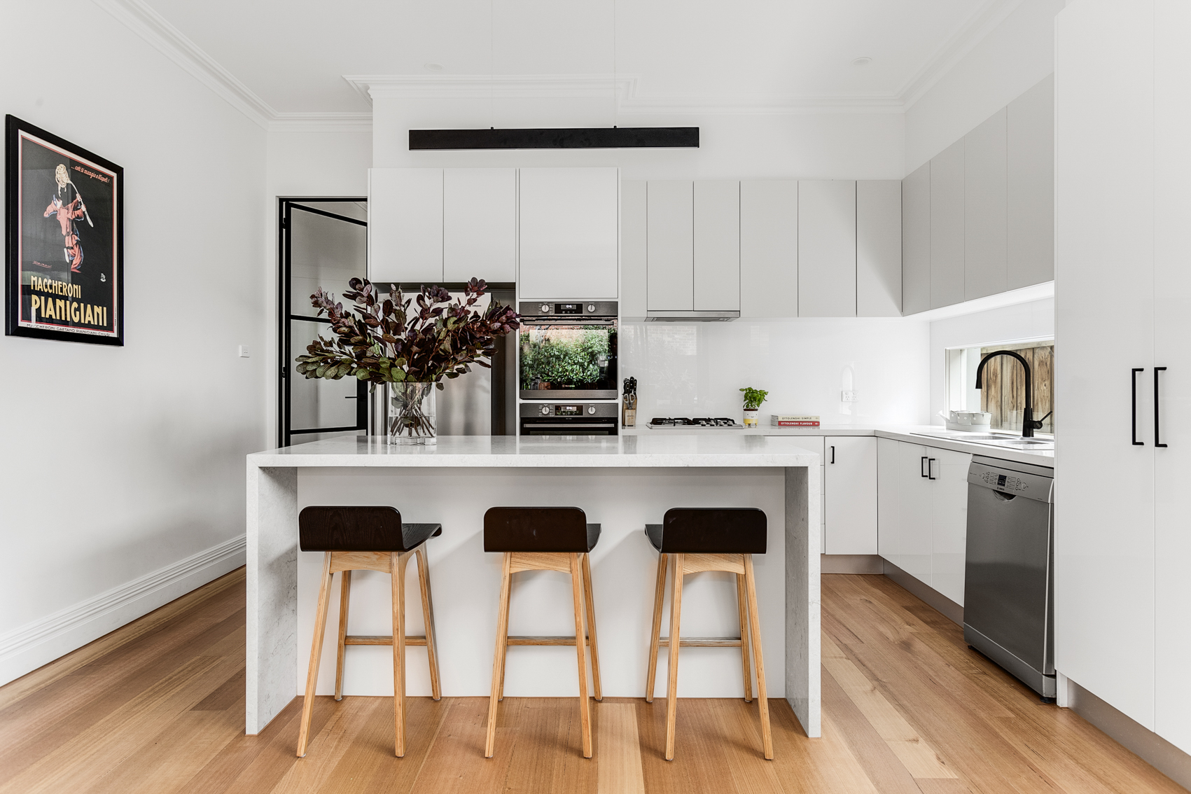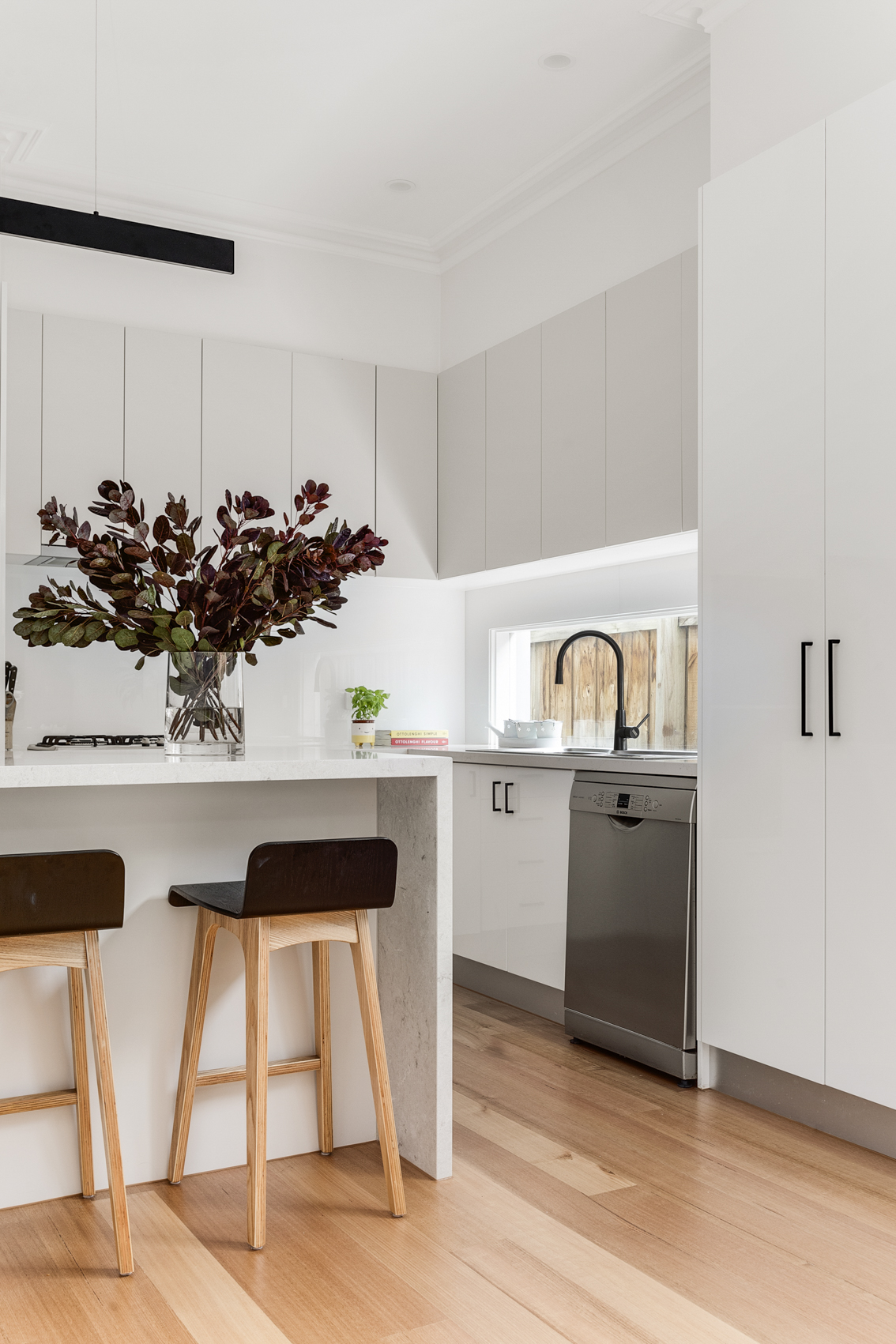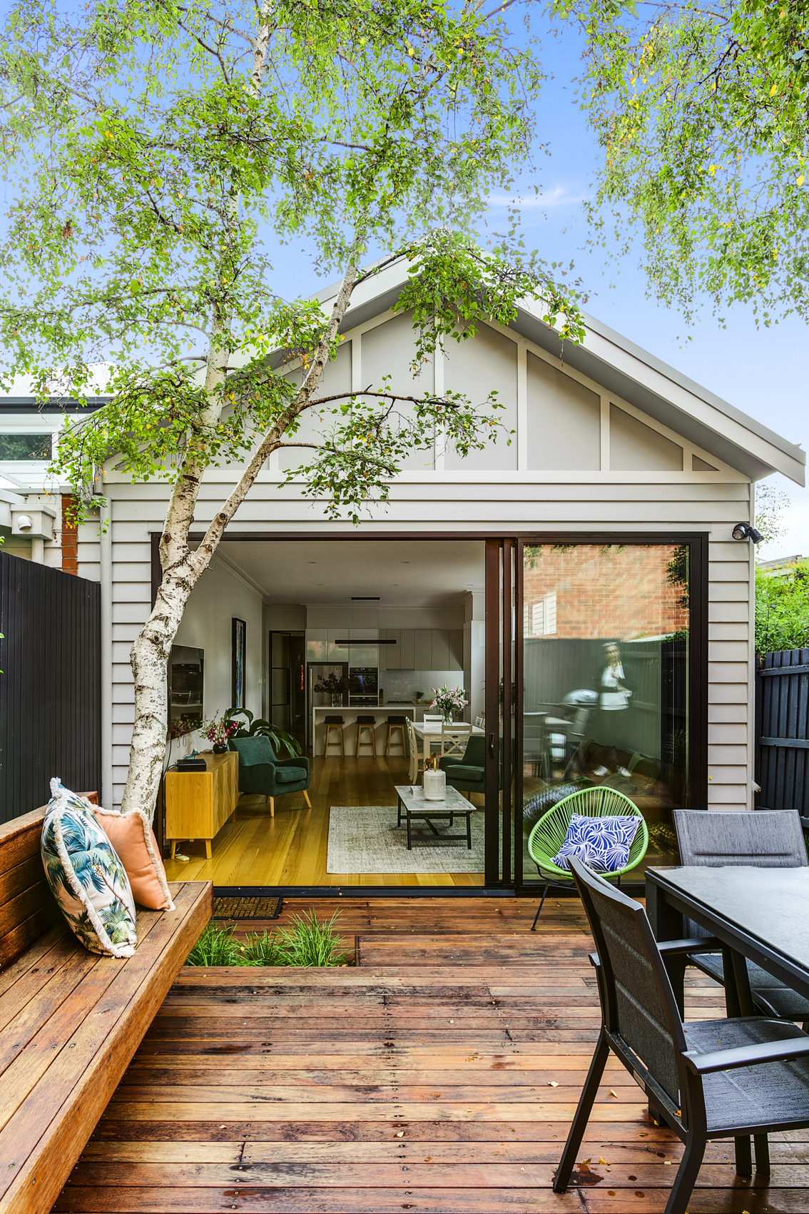 Whilst respecting the existing architecture, we modernised the downstairs with the addition of an open plan kitchen, dining and living space. The adjacent courtyard forms an extension of the living space, as well as provides a tranquil space to relax for hours.