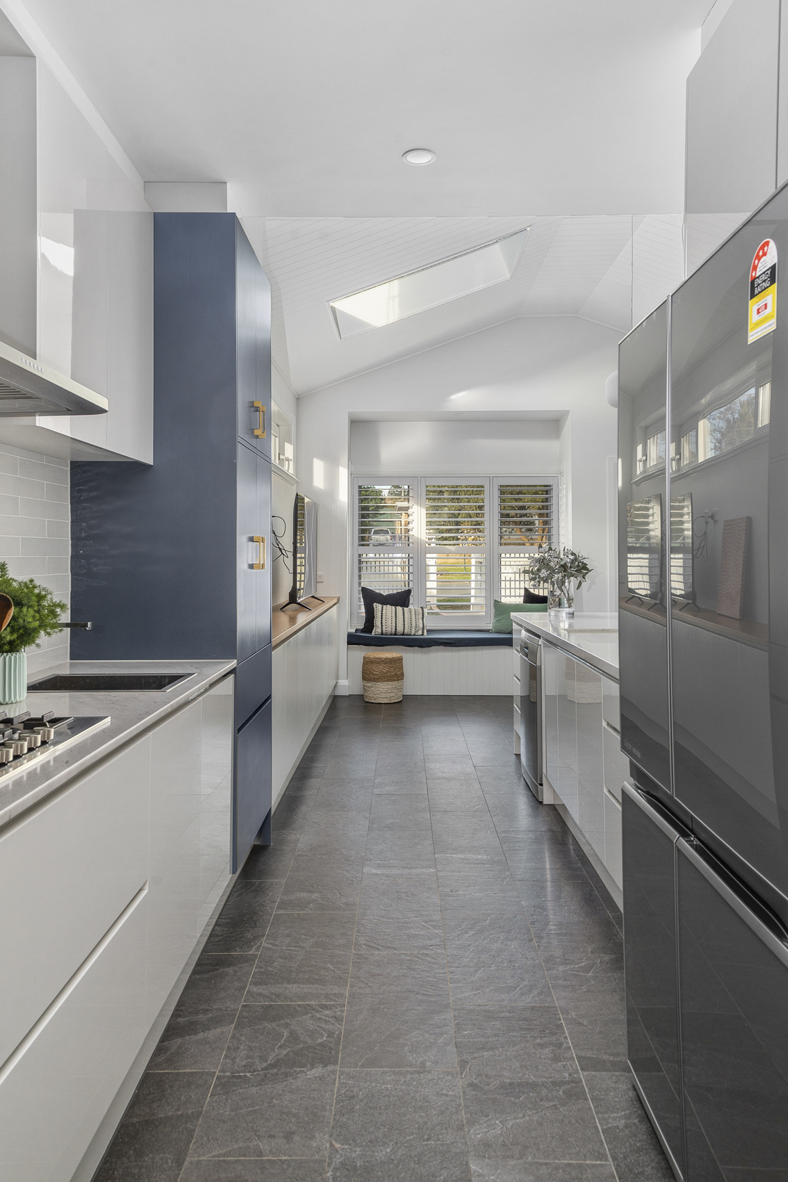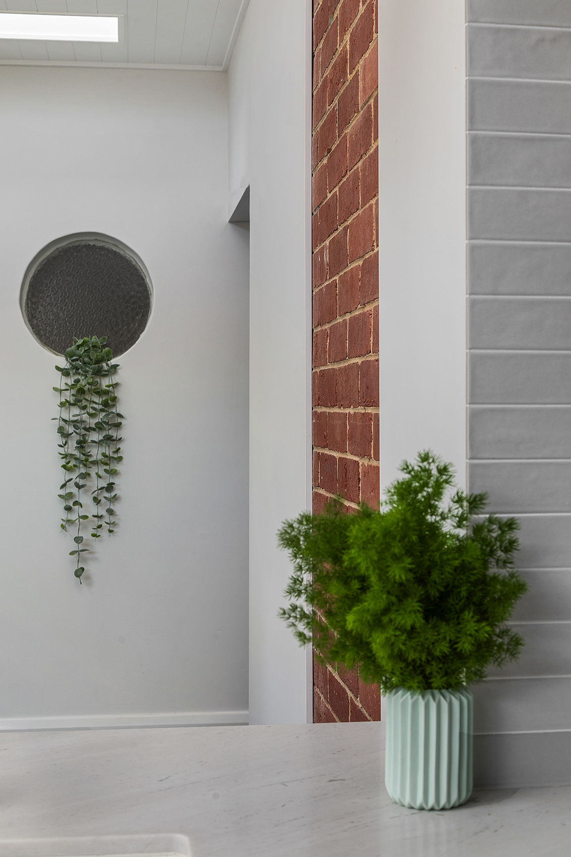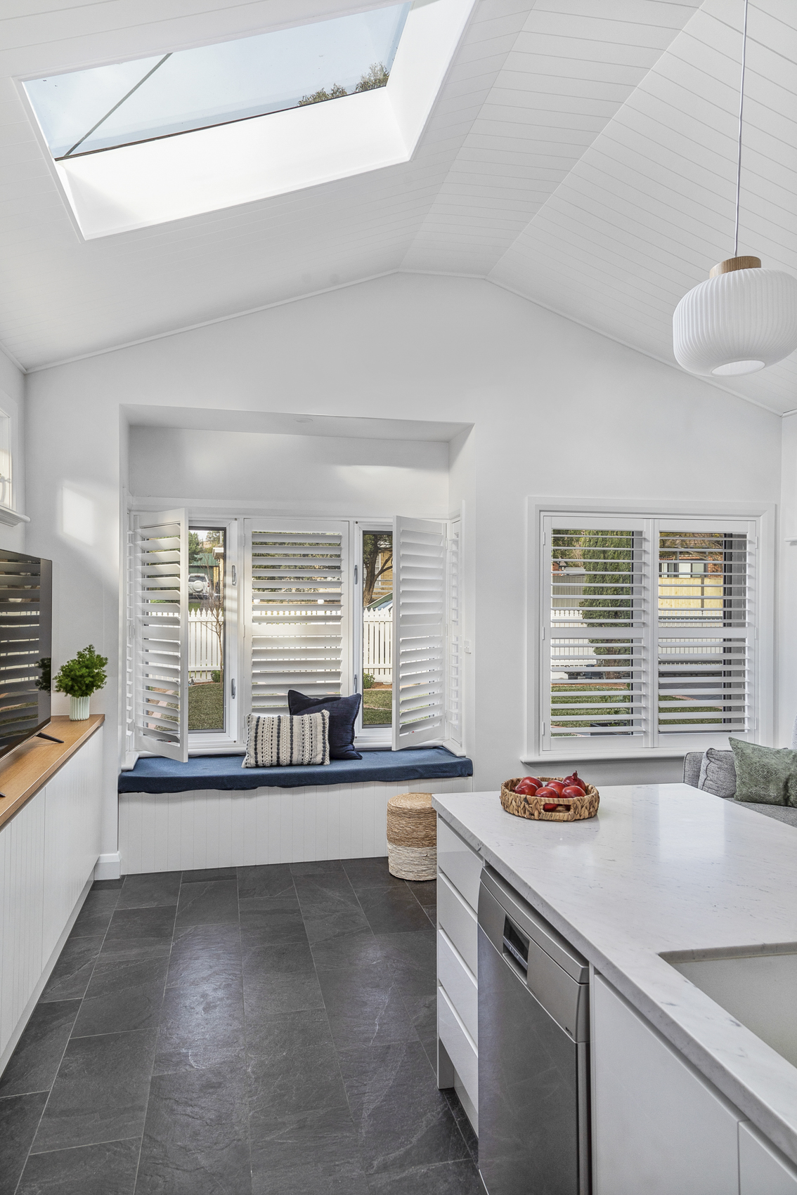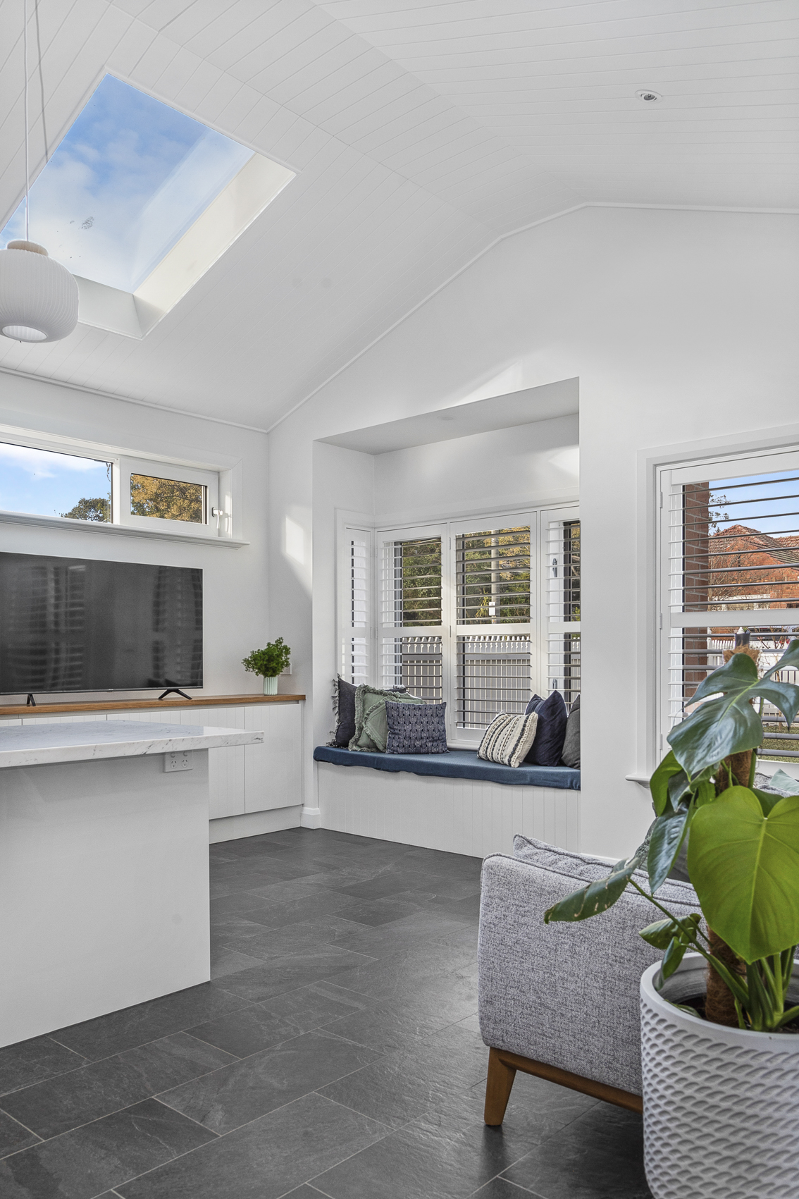 We achieved this by keeping some of the original rear of the home exposed, which gives you a glimpse of the solid construction underneath. The use of steel trusses allowed us to really open up the Living area off the kitchen and create some interest in the ceiling giving a sense of space. Keeping existing round windows while adding skylights to this space provides further detail and character while letting in light.