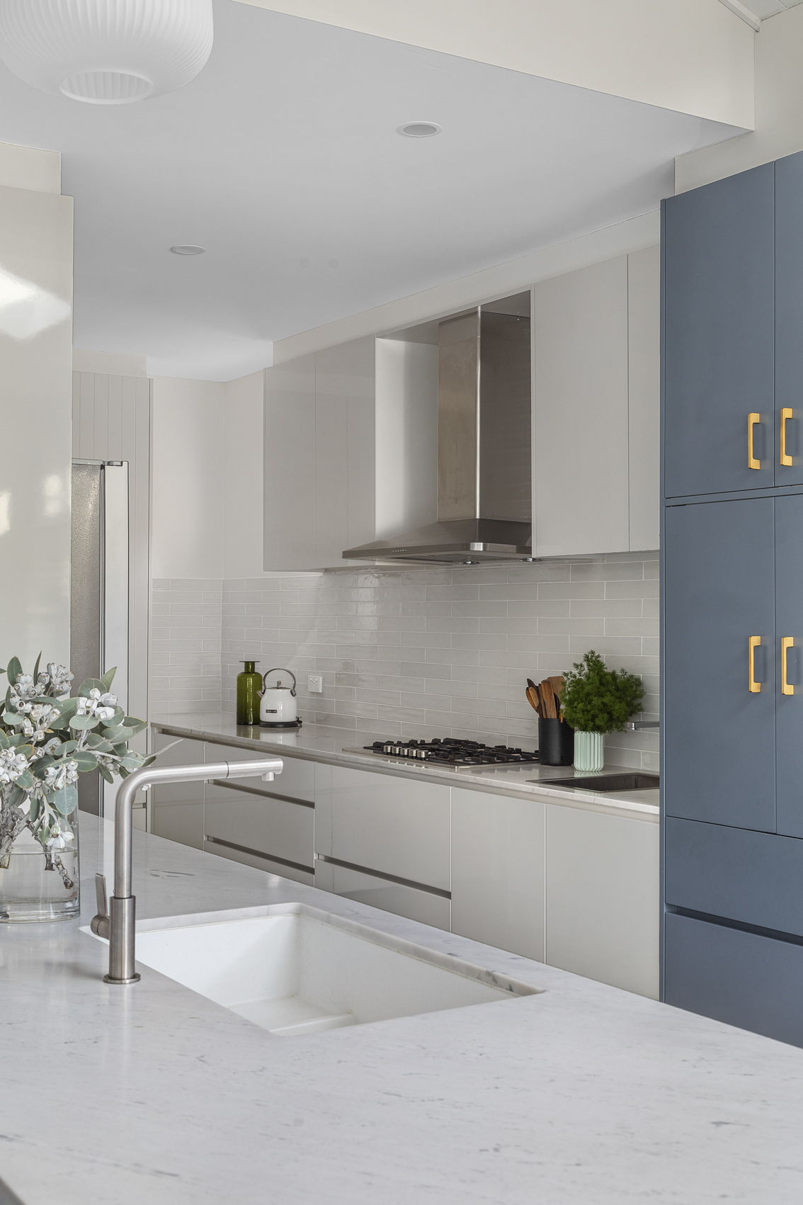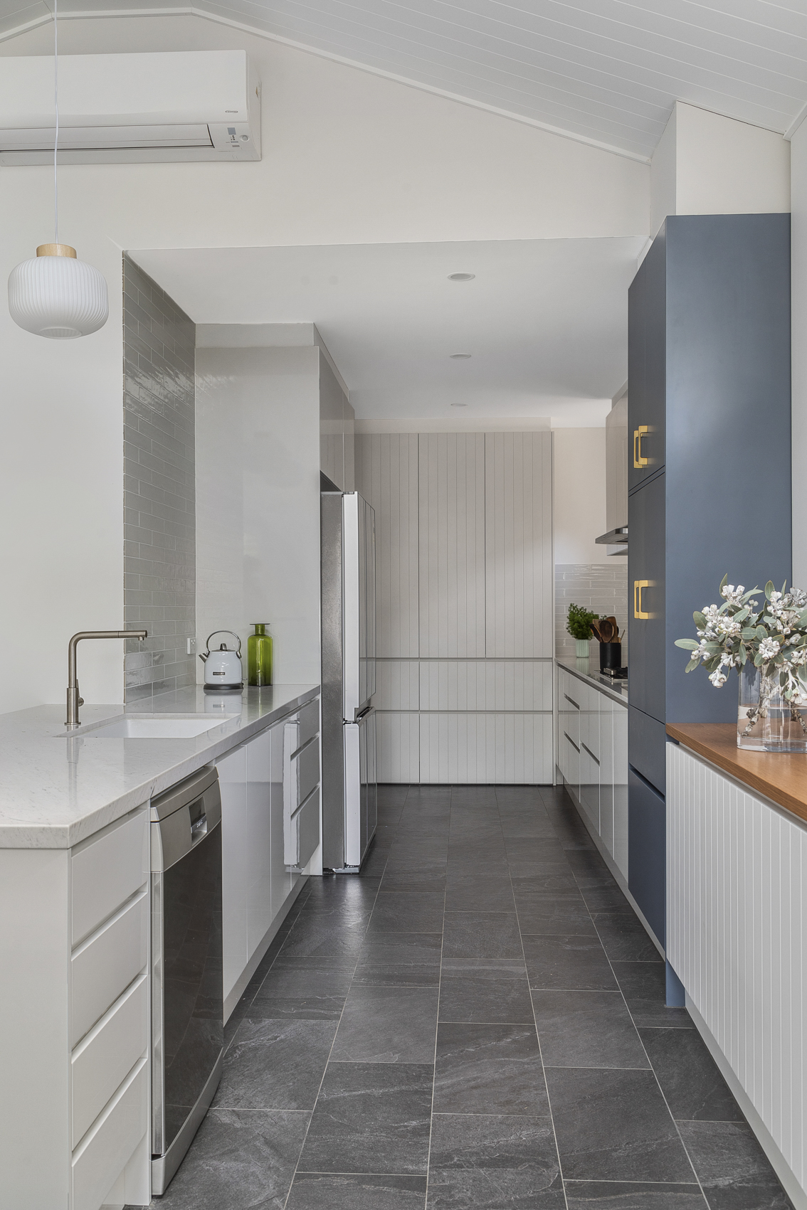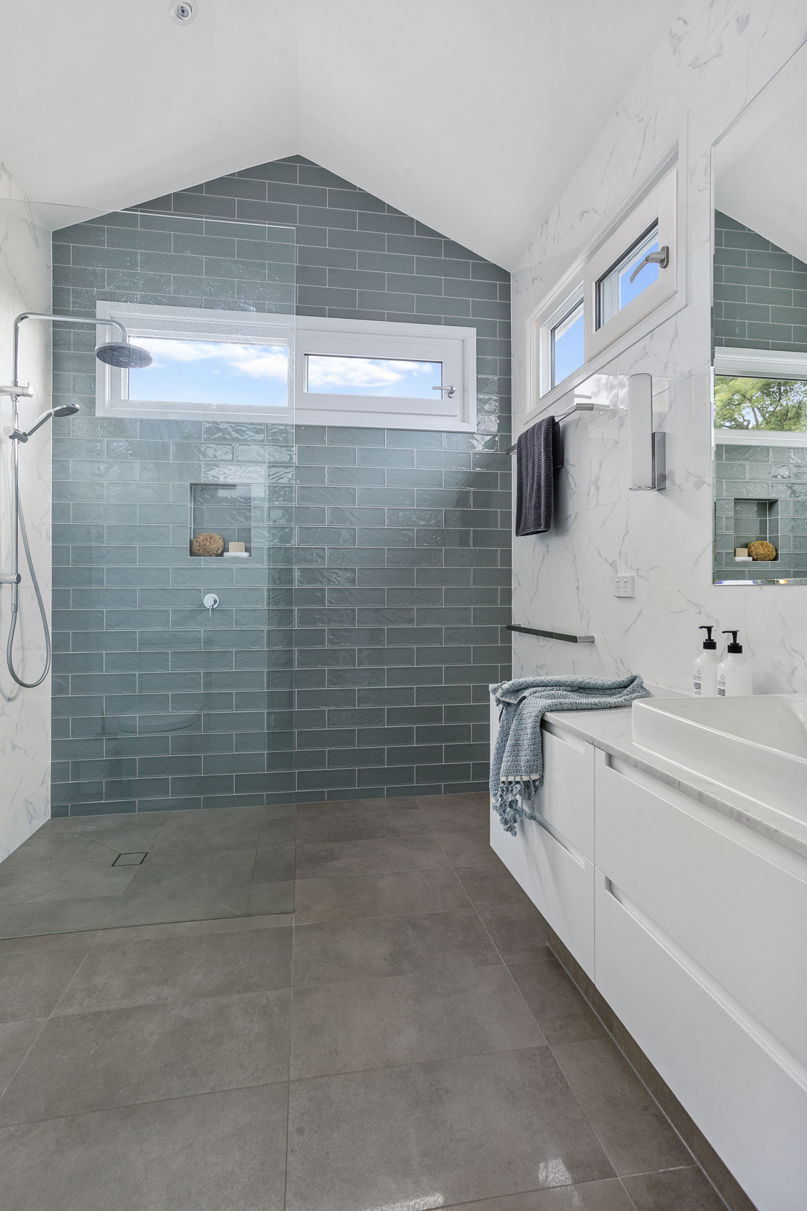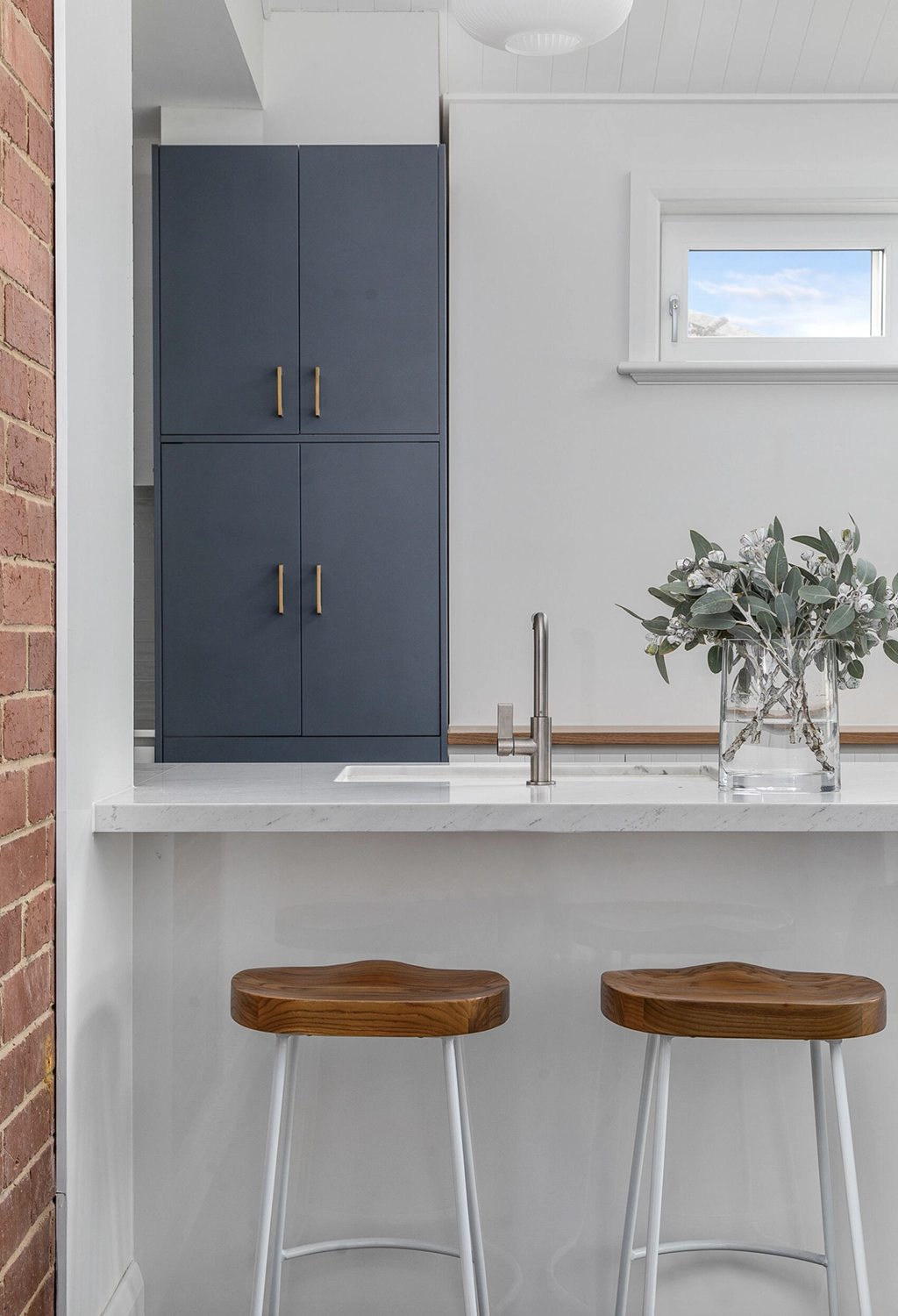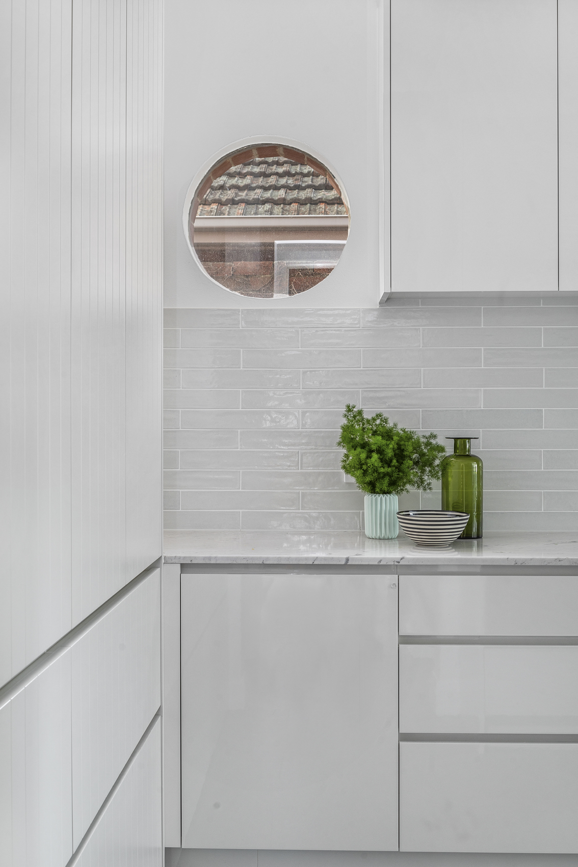 We achieved this by keeping some of the original rear of the home exposed, which gives you a glimpse of the solid construction underneath. The use of steel trusses allowed us to really open up the Living area off the kitchen and create some interest in the ceiling giving a sense of space. Keeping existing round windows while adding skylights to this space provides further detail and character while letting in light.